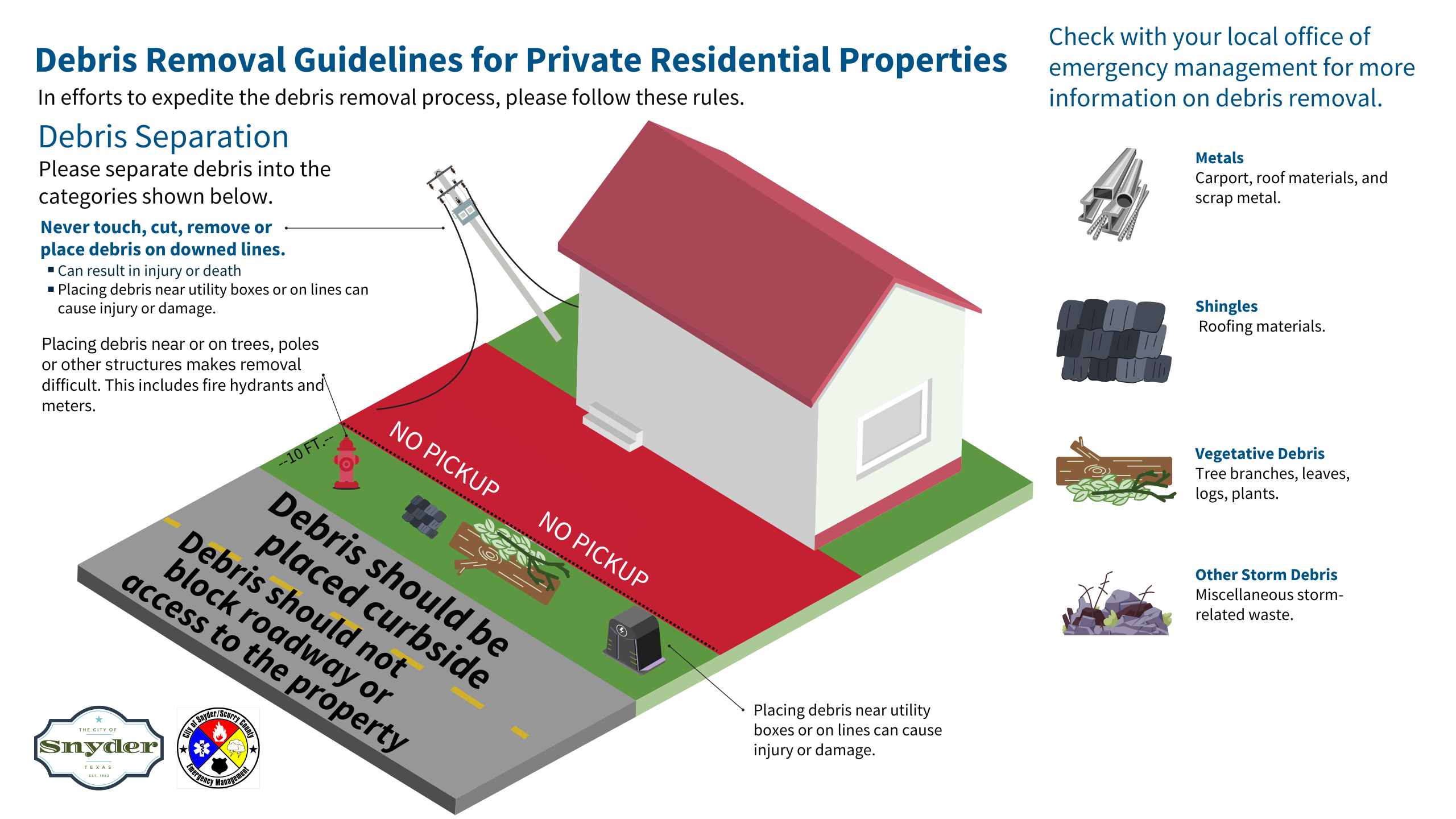 Debris must not block stop signs, fire hydrants, or obstruct driver visibility. Residents must request pickup by calling the Office of Emergency Management (325) 573-6215, City Hall at (325) 573-4957, or emailing snyderoem@gmail.com with their name, address, and a brief description.